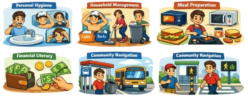 Self‑care • Home tasks • Money management • Communication • Transportation • Job readiness